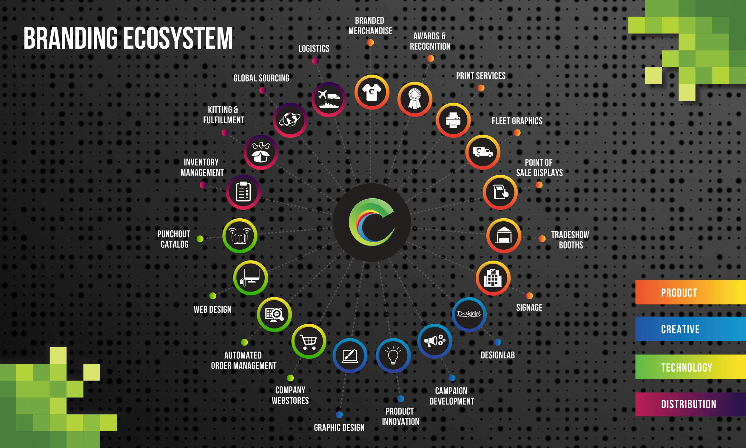 Club Colors offers a full assortment of branding solutions. We are well known for our branded apparel and promotional product giveaways. In addition we’re also great at spatial branding, signage, print and anything else that requires a innovative branding solution. The ecosystem graphic below will give you a full picture of services we offer. Feel free to send any inquiries our way and we’ll assist and advise.